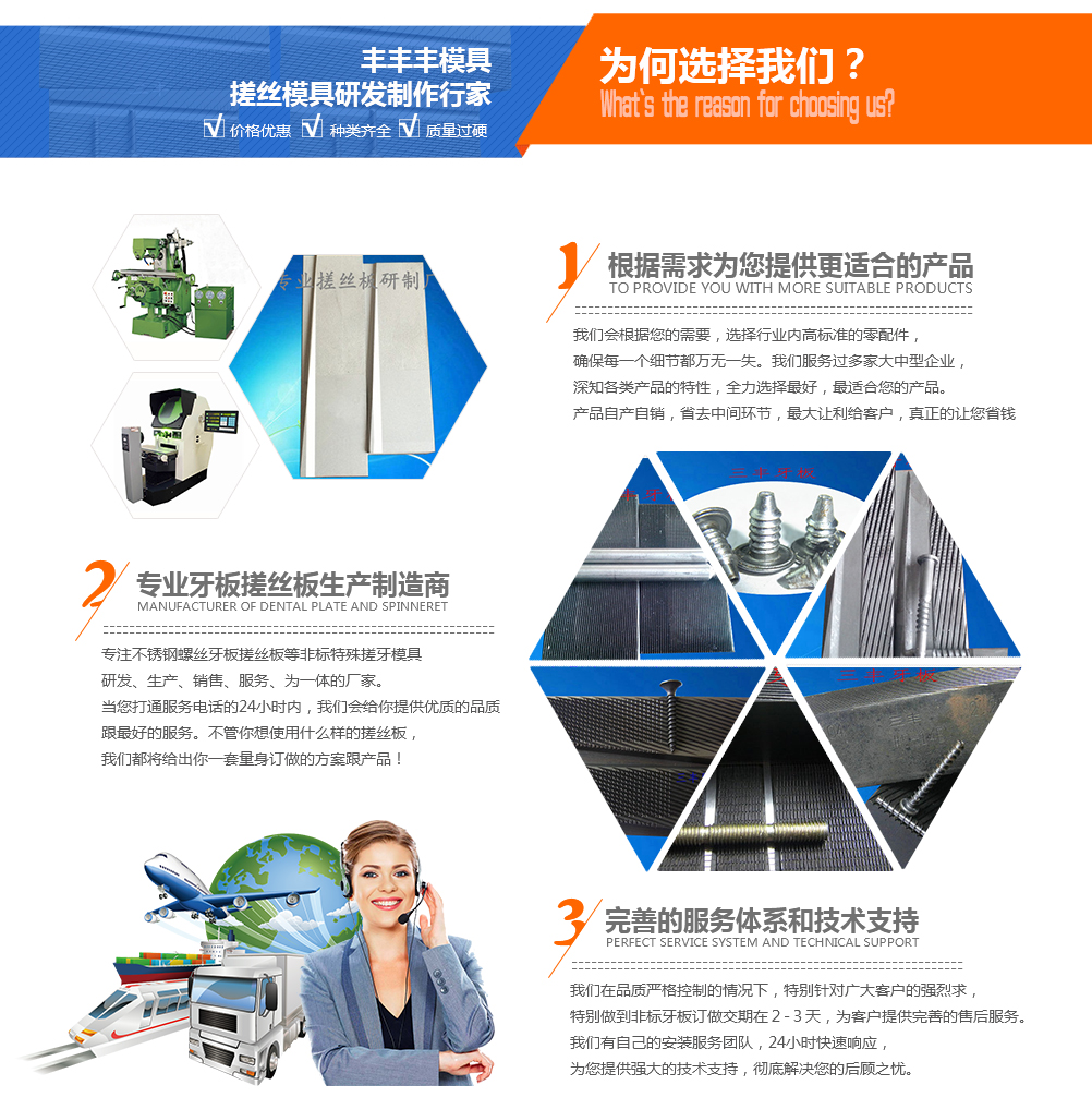 我們始終抱持著勤、誠、信的原則,致力于螺絲牙板、搓絲板產(chǎn)品專業(yè)廠商。多年來,由于全體同仁的勤奮、誠樸與使用客戶的支持與信任。造就三豐牙板品牌在業(yè)界樹立的良好形象,也建立了品質(zhì)保證的優(yōu)良信譽。勤、誠、信是三豐牙板全體同仁共同遵循的中心理念,更是我們服務(wù)客戶的宗旨。主營產(chǎn)品:不銹鋼搓絲板,不銹鋼機絲倒角切平牙板,D/W雙線單出(ss)墻用細(xì)牙搓絲板,機絲束桿圓尾牙板,機絲帶圈位螺絲牙板,高低牙自攻牙板,機絲帶溝五溝牙板,不銹鋼扭花紋搓絲板,牛仔釘牙板,直齒搓花板等搓絲模具。產(chǎn)品可滿足國標(biāo)(GB)、德標(biāo)(DIN)、美標(biāo)(ANSI)、日標(biāo)(JIS)、國際標(biāo)準(zhǔn)(ISO)等各種國際通用標(biāo)準(zhǔn),并能根據(jù)客戶實際要求,設(shè)計訂做各種特殊非標(biāo)規(guī)格...